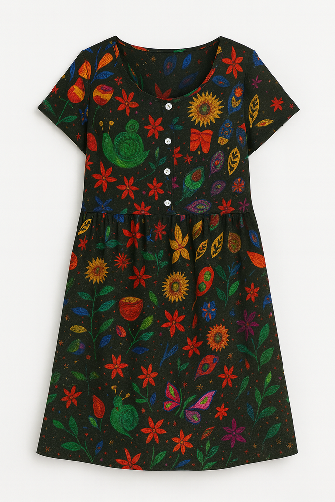 Bring colour to your everyday with the Tropical Garden Drop Waist Dress - a vibrant, easy-wear piece that feels as joyful as it looks. Worn here by Teresa and Amelia, this print flatters all generations with its hand-drawn floral and botanical motifs on a soft black base.