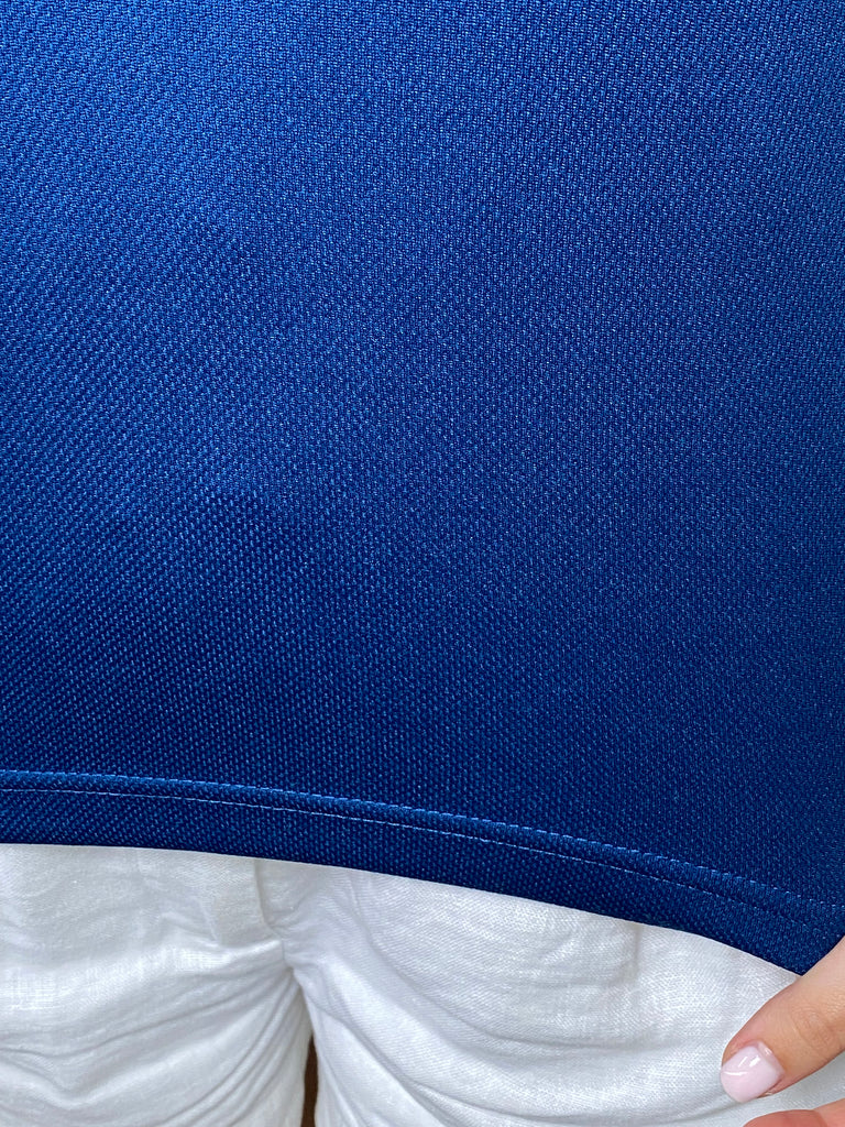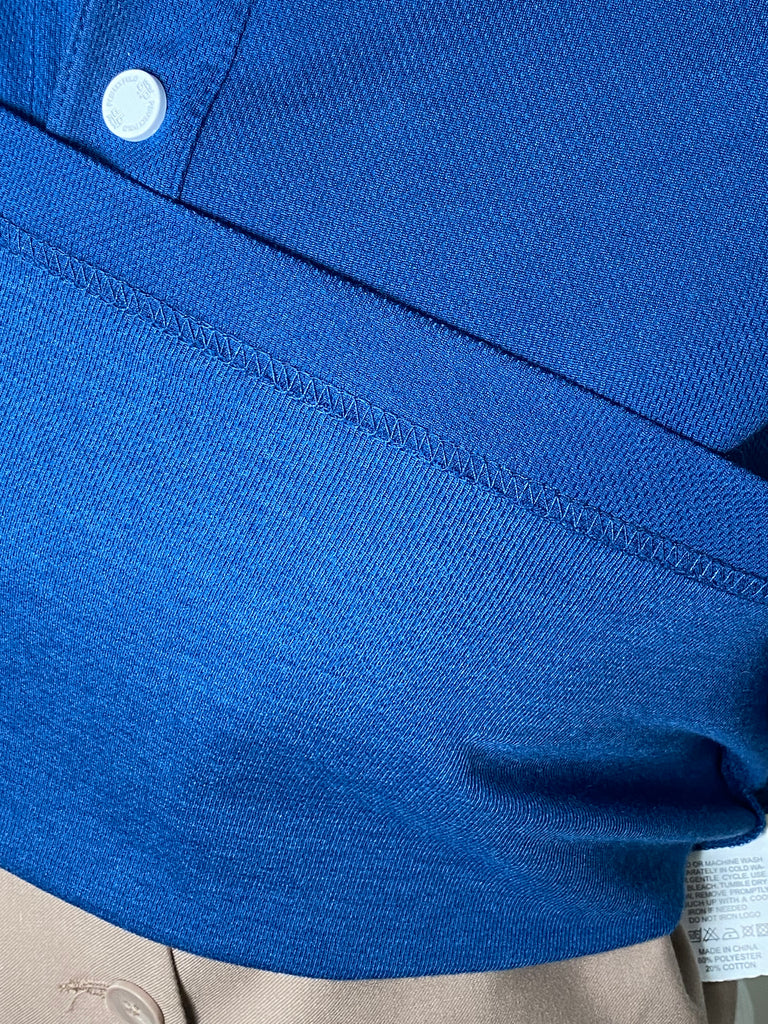 - Split side vents at the bottom hem with navy contrast for added comfort and movement