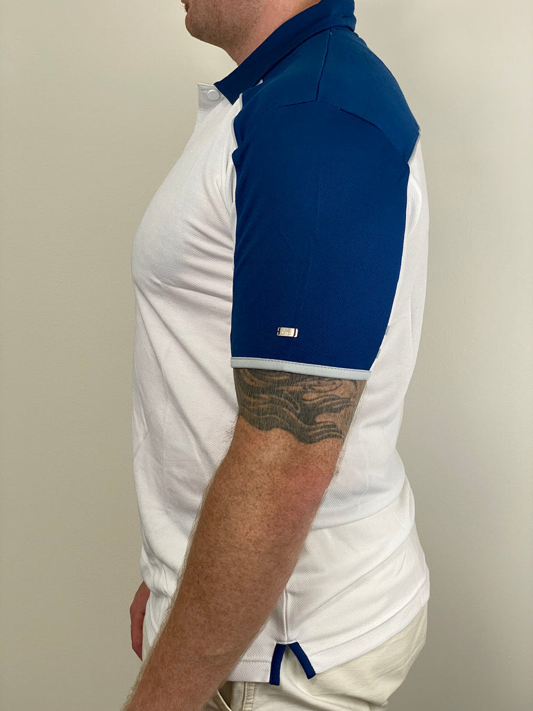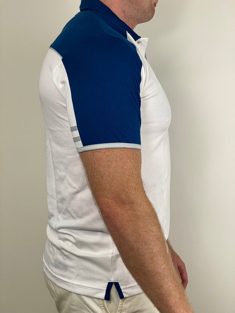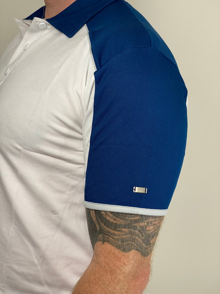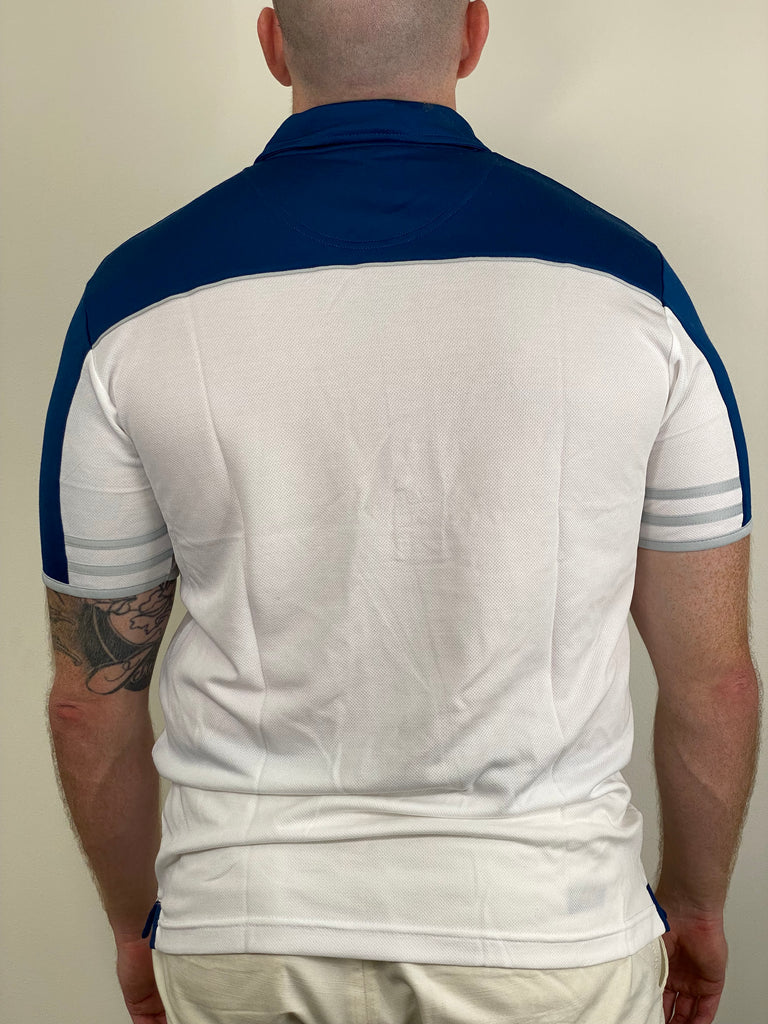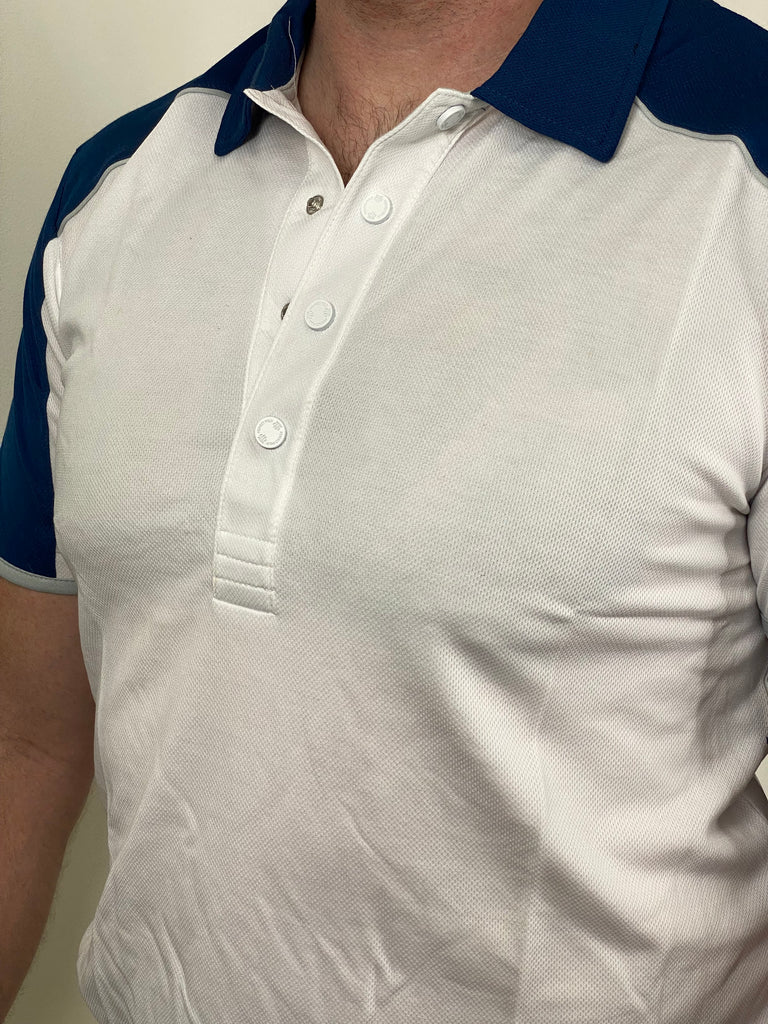 - Clean white polo with navy contrast accents